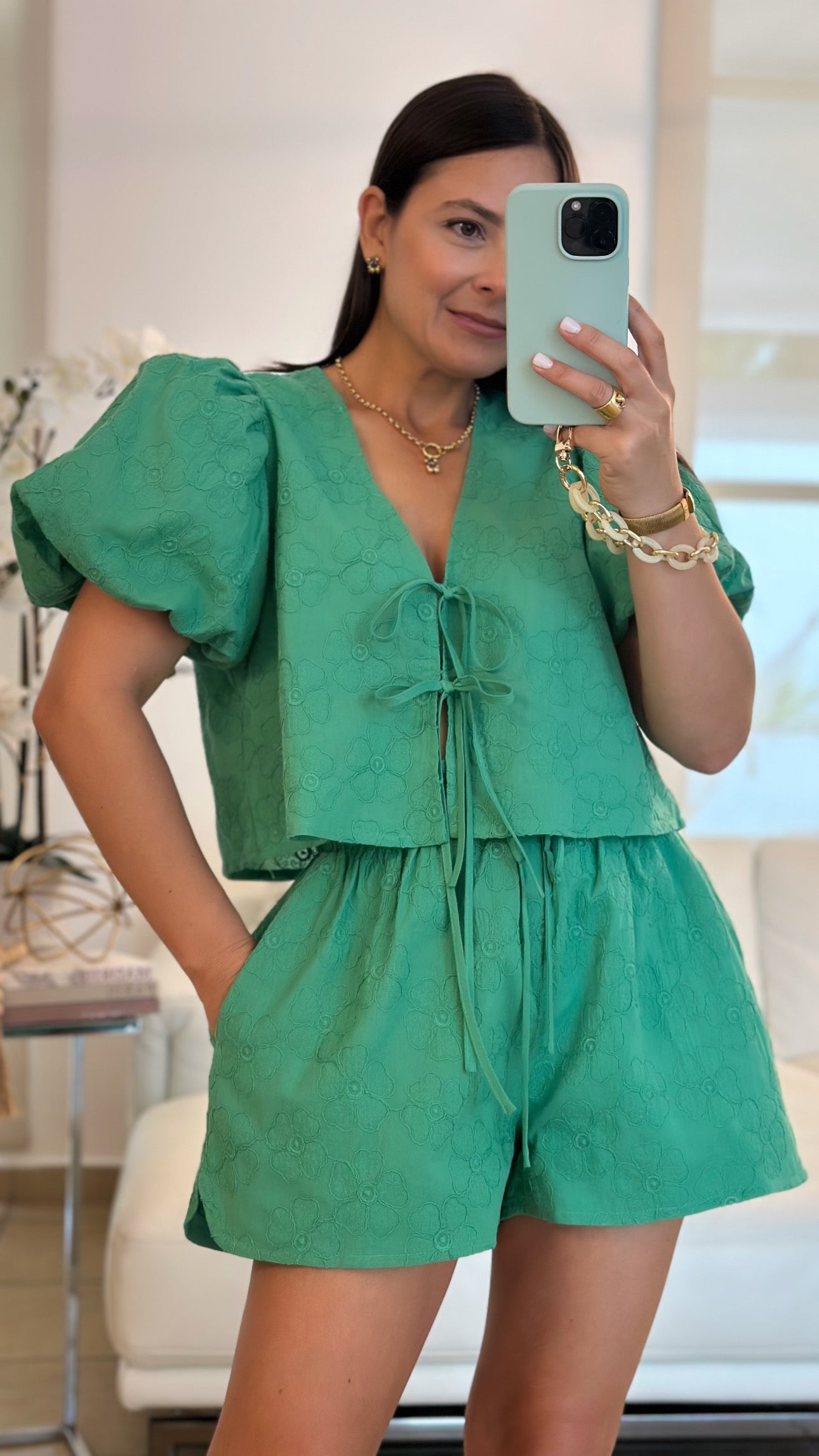 Emerald green embroidered bubble sleeve top and short pant set