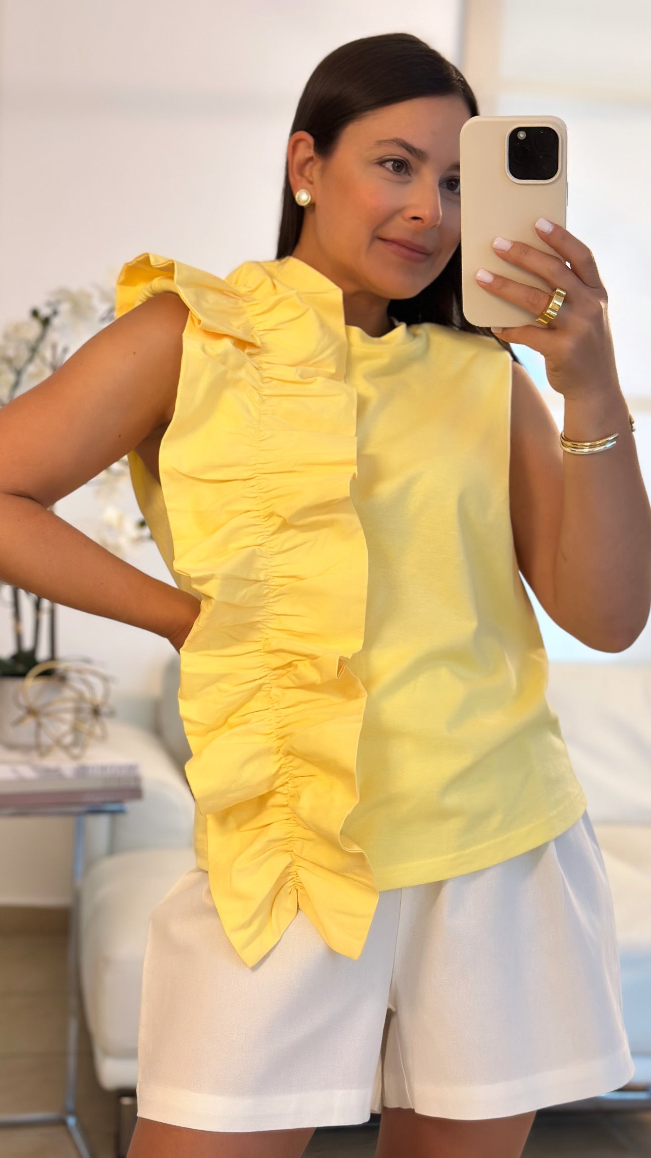 Butter yellow ruffle detail cotton top