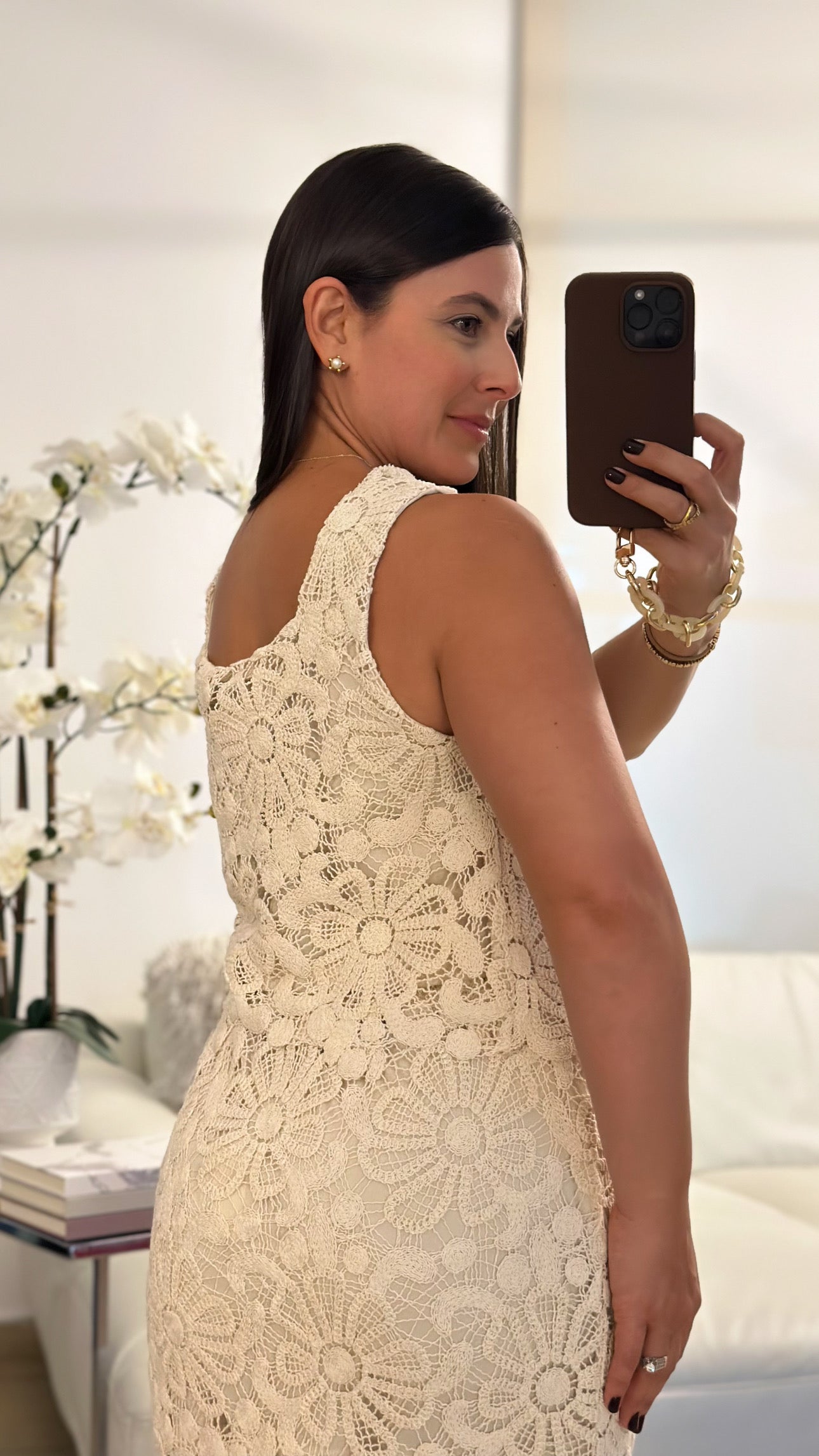 Beige flower crochet sleeveless top and knitted midi skirtĀ