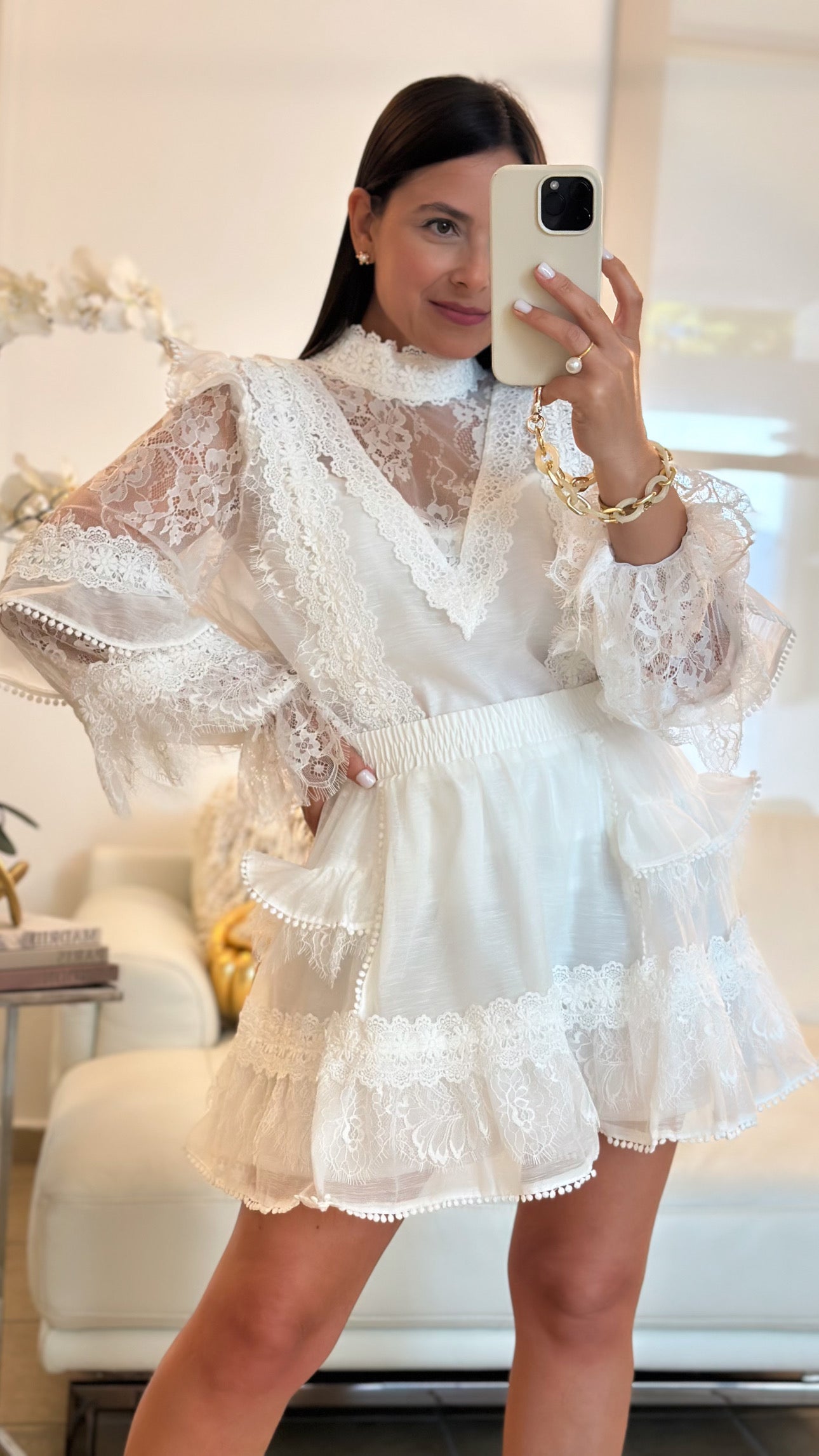 White lace and crochet details long sleeve top and mini skirt setÂ