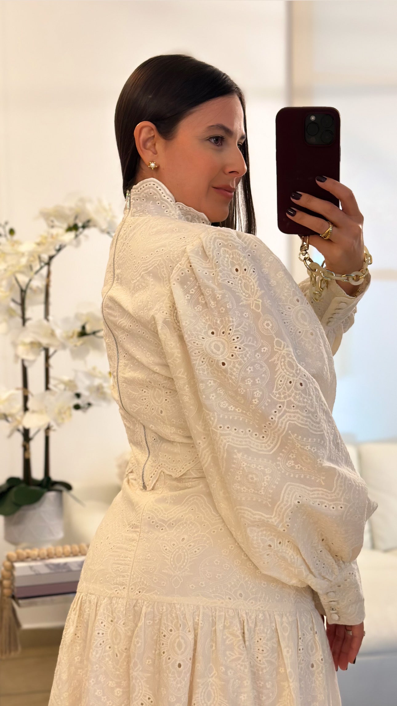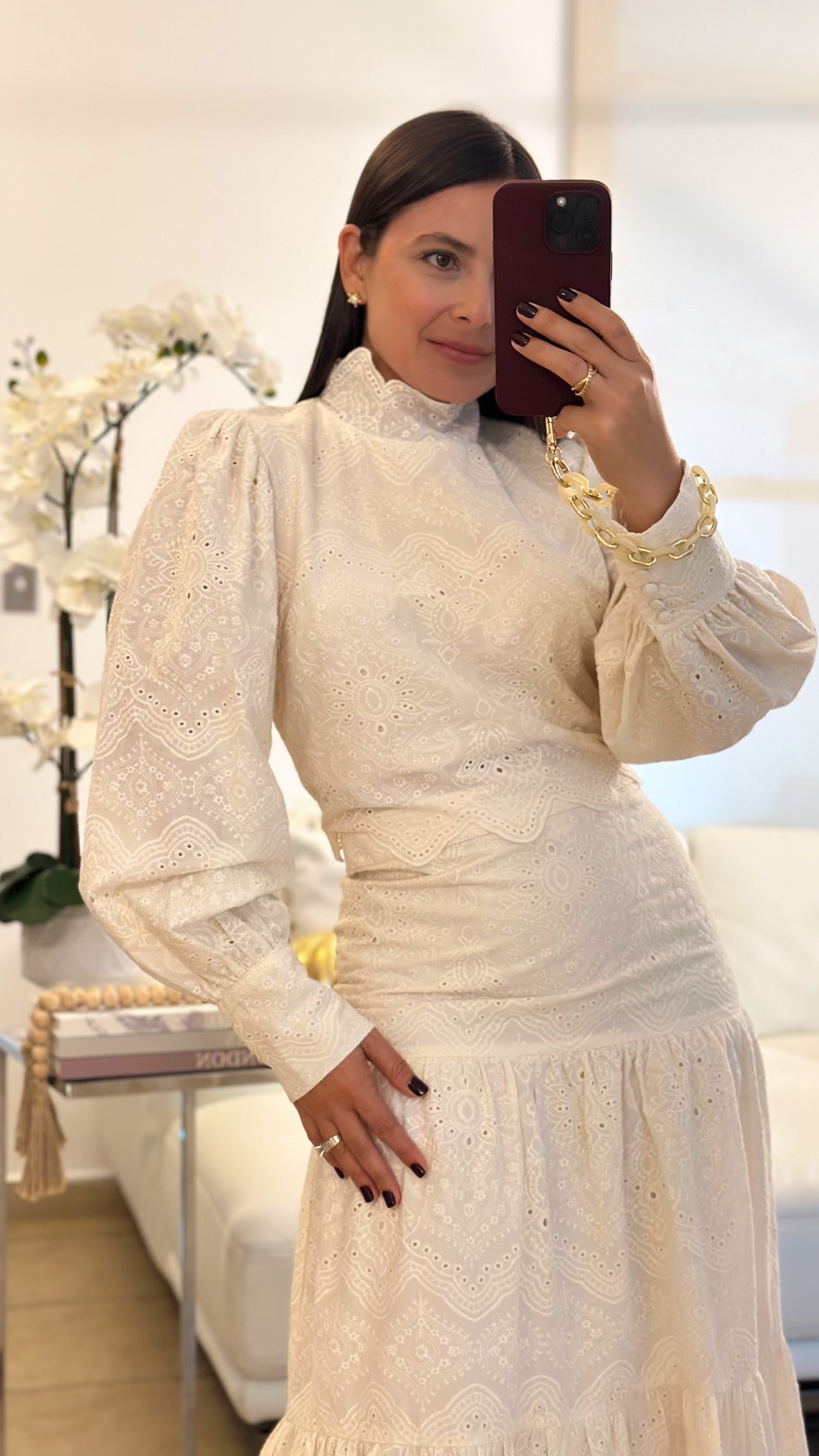 Ivory eyelet long sleeve top, crop top and midi skirt trÃo set