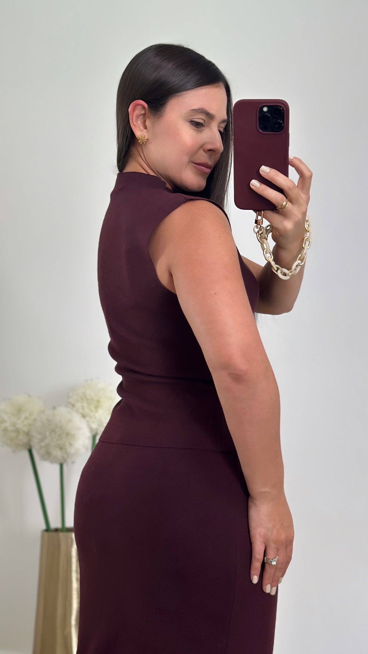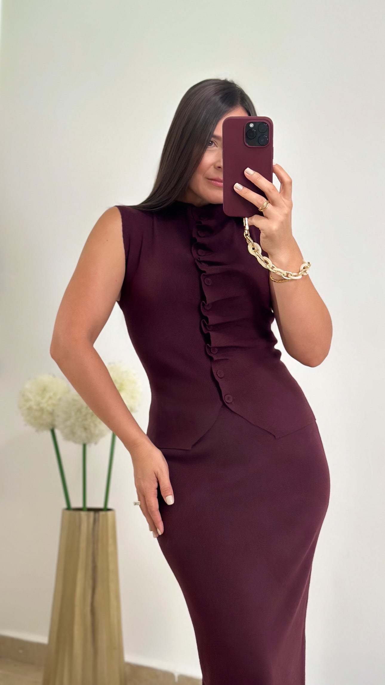 Burgundy knit top and midi skirt setÂ
