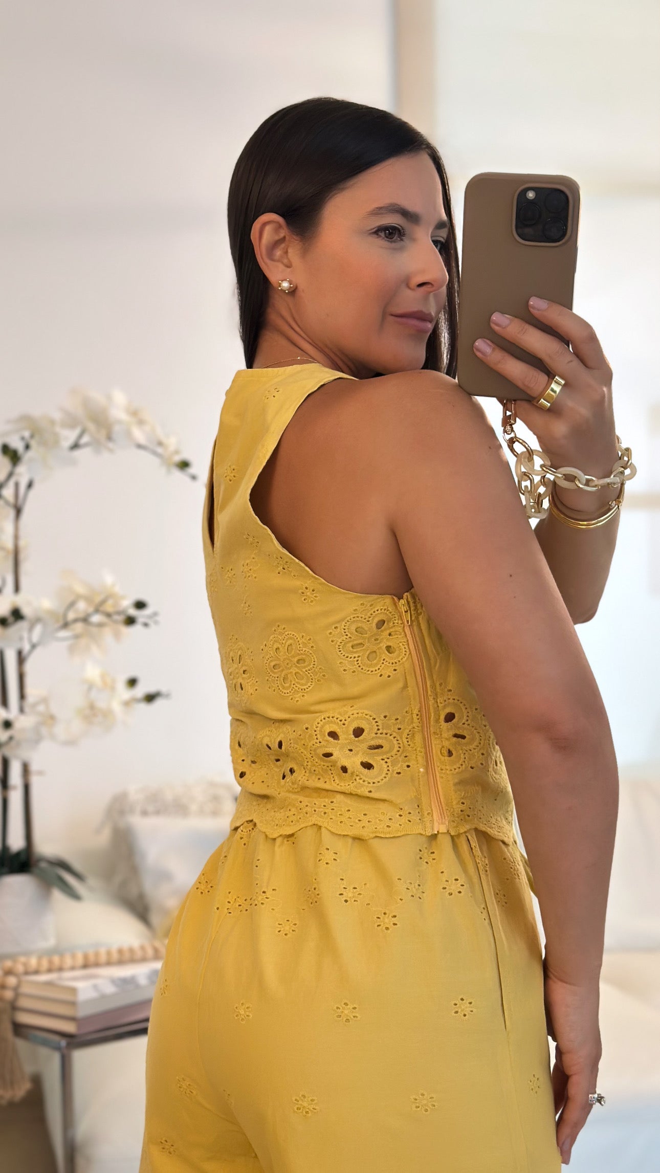 Mustard eyelet crop top and wide leg pant set