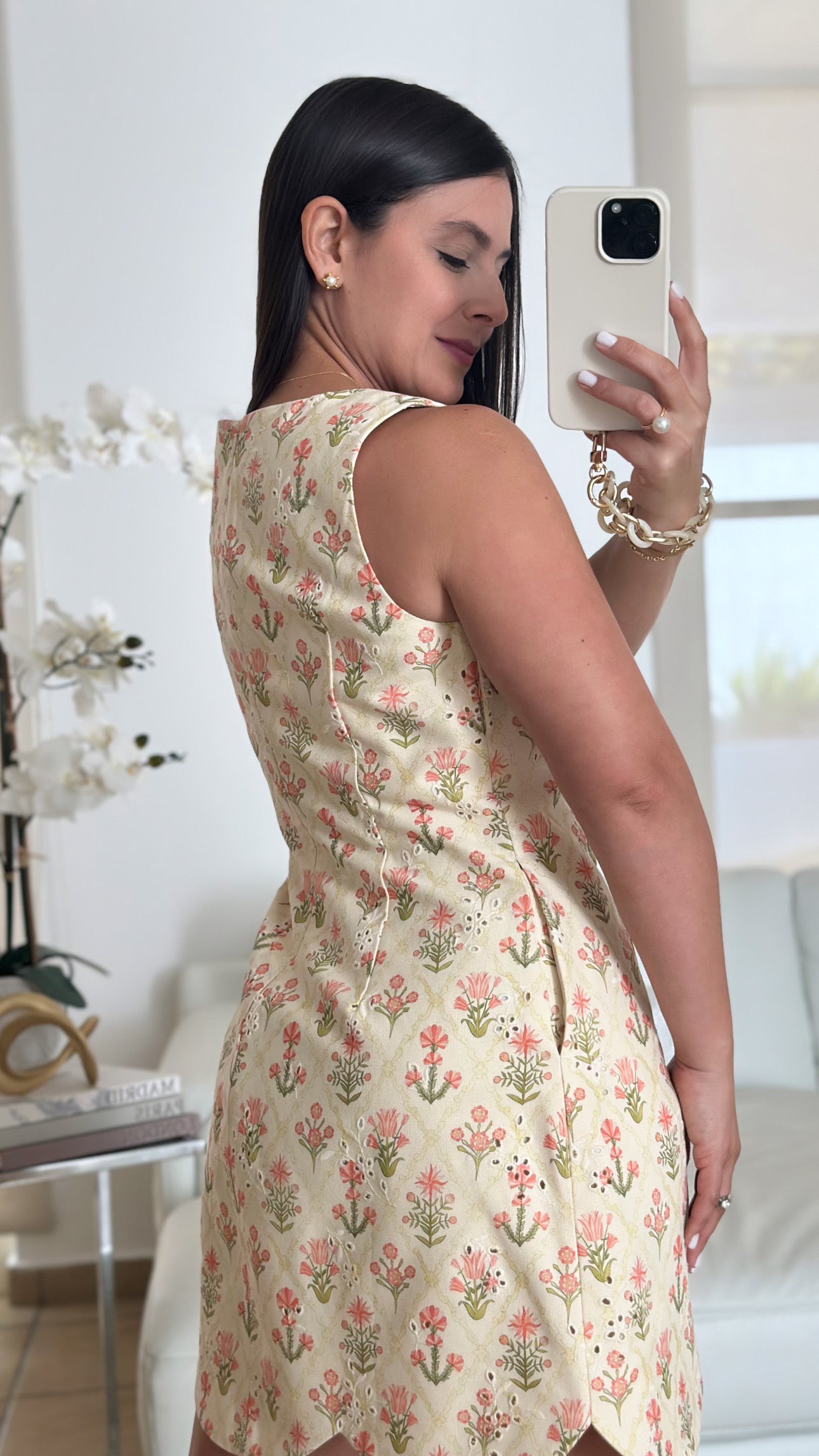 Coral floral print eyelet mini dress with scallop hem