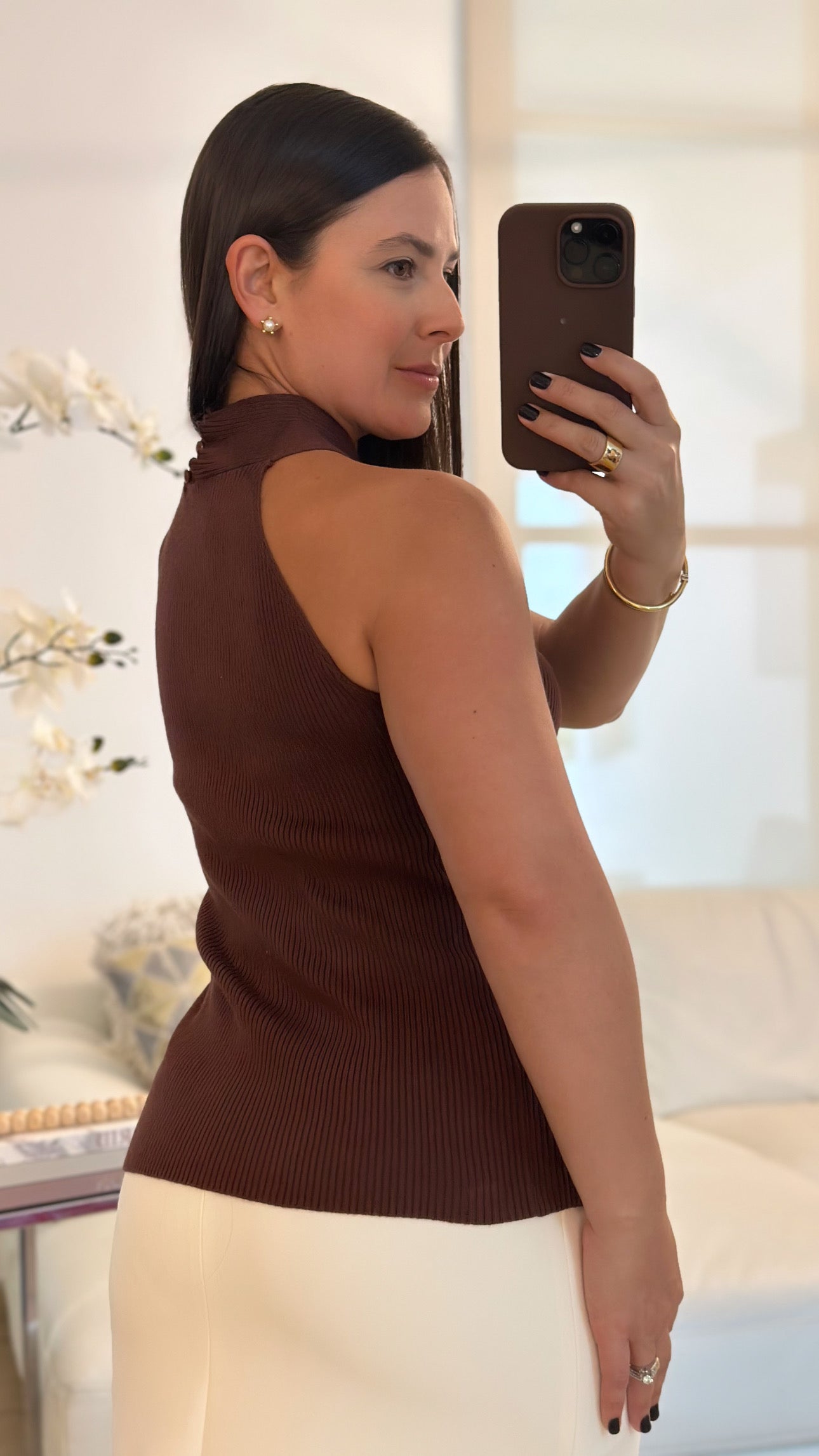 Chocolate knit cross front halter top