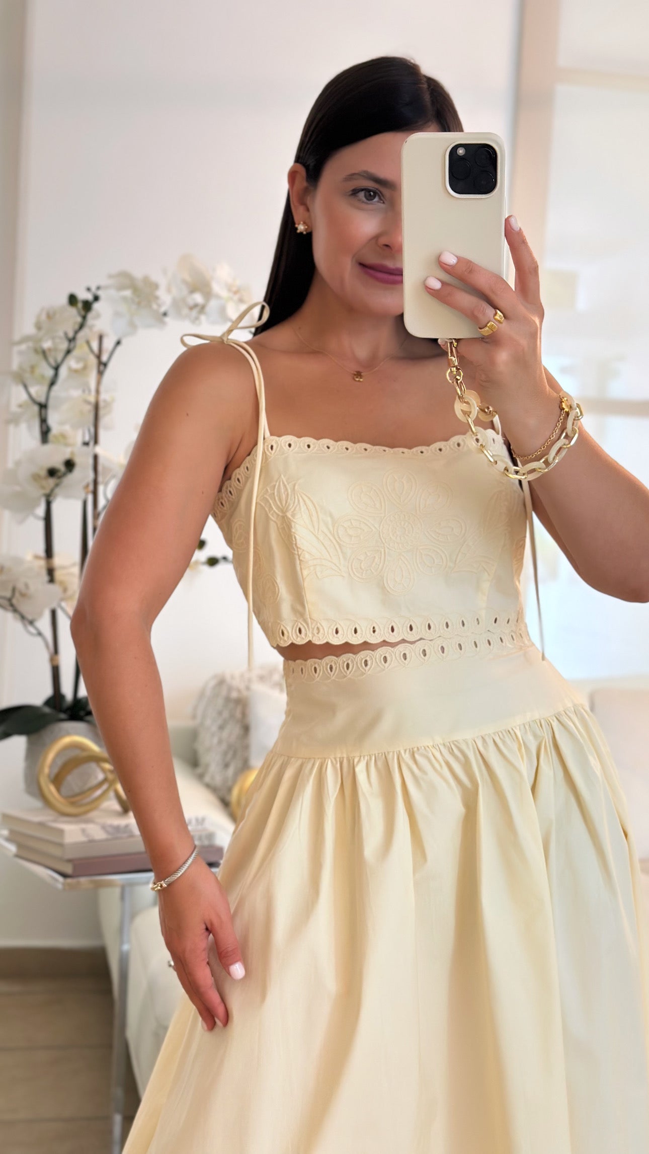 Butter yellow embroidered crop top and midi skirt set